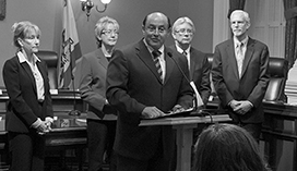 | State Sen. Lou Correa briefs the news media on SB 843, a bill to protect students while ensuring due process for teachers. Also appearing in support of the bill are, from left: Sheila Boxley, president and CEO of the Child Abuse Prevention Center; CSBA President Josephine Lucey; CSBA General Counsel Keith J. Bray, who also directs CSBA's Education Legal Alliance; and Mike Smith, chair of the ELA's advisory board. |