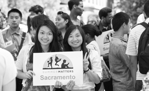 | Sacramento City Unified students Mimi Wong, left, and Marilynn Wong, right, are spending their summer in a City Hall program to learn about pressing issues in their community and network with city officials. They were among hundreds of students from around the state who gathered at the state Capitol June 20 for a rally and activities to kick off the summer learning season. The event was organized by the Summer Matters campaign chaired by state Superintendent of Public Instruction Tom Torlakson. See more about summer learning at www.csba.org/SummerLearning. |