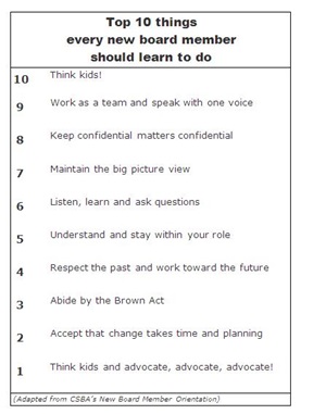 We really stress the importance of having a new board member orientation. My preference is that they do that as an entire board, with the superintendent. Maybe it’s about facilities or Program Improvement; ask ‘How do I learn about all that? How do I know what that means?’ They are learning a second language. And they should be strong enough, when somebody’s using an acronym, to say ‘would you help me remember what that means?’