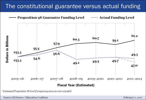 “The result of removing the governor’s tax proposals is an approximately $2 billion decline in the Proposition 98 minimum guarantee for 2011–12. Balancing the budget with the constraints you have given us, however, would require even larger reductions in K–14 funding,” the head of the nonpartisan Legislative Analyst’s Office wrote to Leno Feb. 10. “As such, our list of alternatives includes a total of $4.8 billion in Proposition 98 reductions—$2 billion due to the assumed rejection of the governor’s tax proposals, plus an additional $2.8 billion to help bring the budget into balance.”