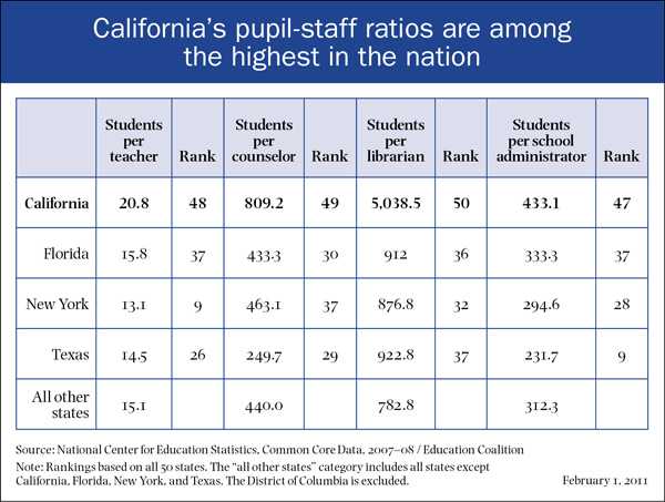 This chart from the Education Coalition’s Feb. 1 press packet shows that California ranked close to the bottom among the 50 states in a number of crucial ratios of students to staff in 2007–08—before the full brunt of three years of budget cuts to California’s schools took effect. |