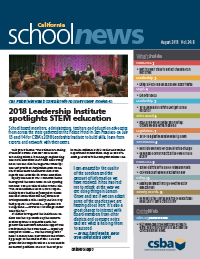 IN THIS ISSUE 2018 Leadership Institute spotlights STEM education Beat the heat: Steps to protect students from heat stress Living a life of purpose as a school board trustee Life after Janus ESSA approved after SBE meeting:Growth models further explored 2017-2018 Legislative session winds down Nominate members for CSBA Directors-at-large Governance Corner School districts settle SMAA reimbursements California court upholds vaccination law Making an impact through effective policy development Developing the next generation of educational leadership in Santa Clara County