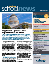 IN THIS ISSUE Legislative Update: CSBA supports LCFF addition Supreme Court to determine constitutionality of union fees We must model unity for our students' sake, and for ours Leadership Institute preview: Google VP of Education Maggie Johnson CSBA Past President Frank Pugh starts term as NSBA president California completes ESSA plan Board Self-evaluation: A tool to support effective governance practice CSBA's Strategic Initiatives Summer Learning: A meaningful and strategic investment Celebrating Asian Pacific American Heritage Month CA Attorney General issues guidance regarding public school immigration enforcement Riverside County reduces gang participation through proactive measures